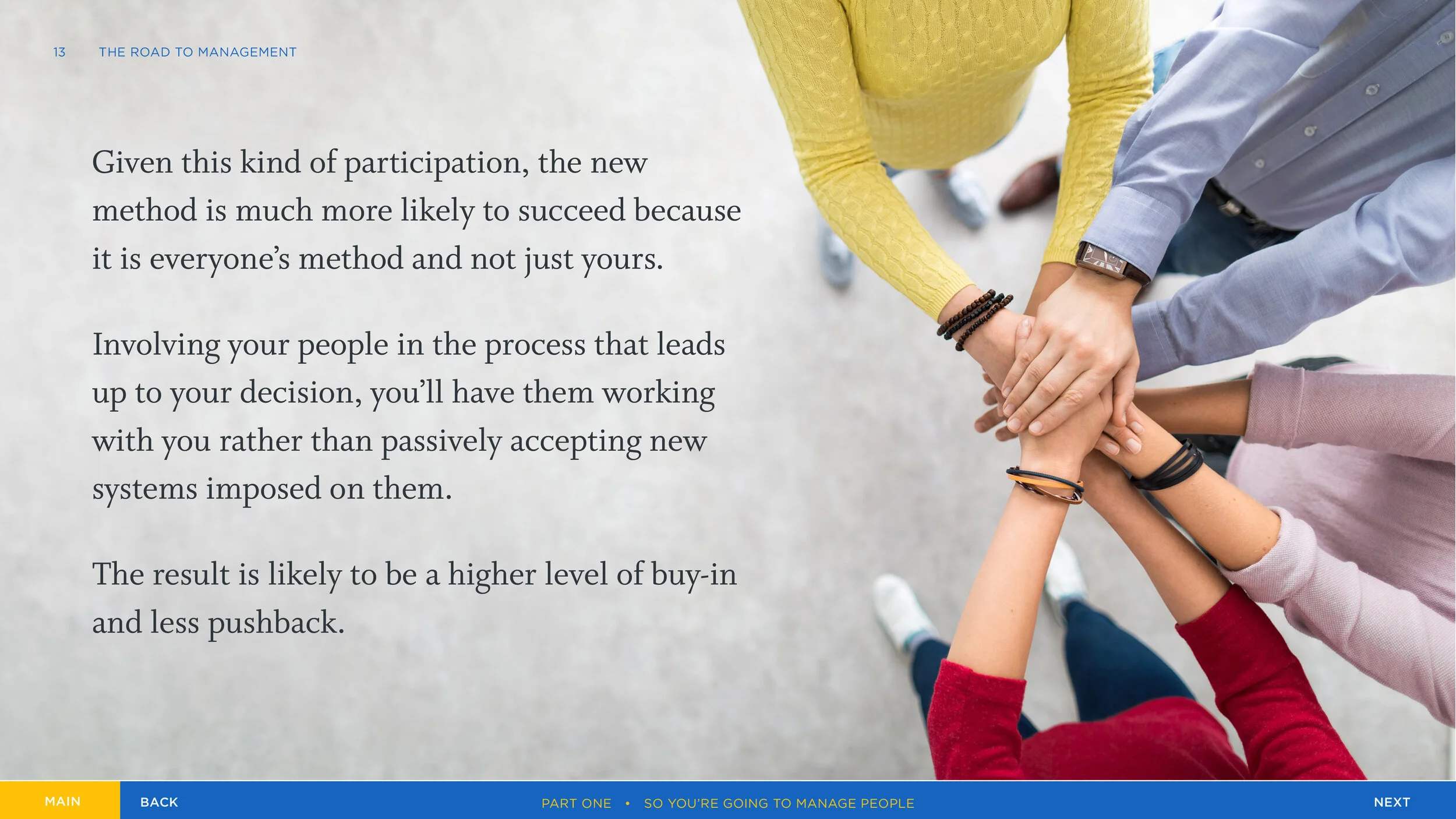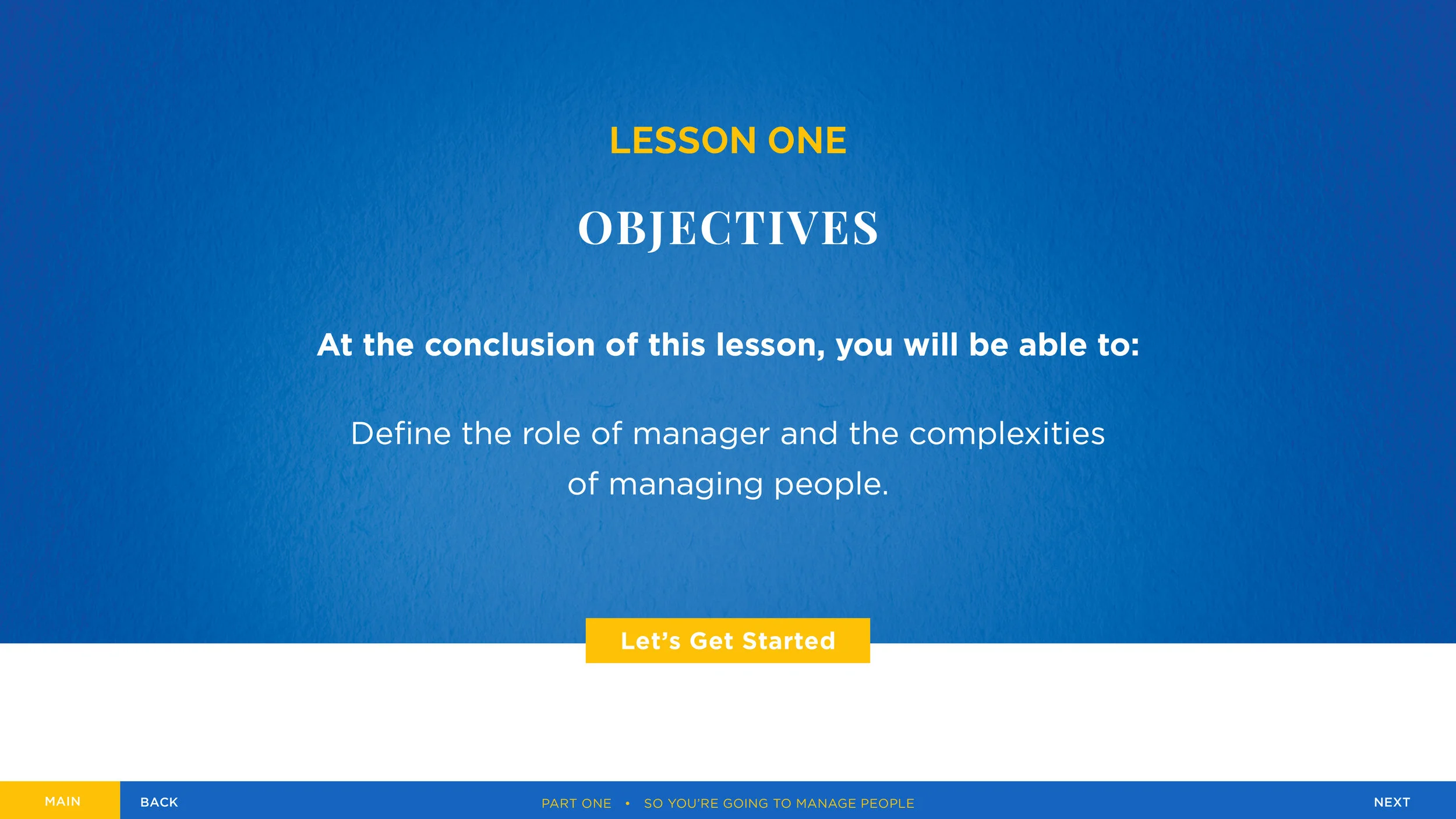 Harper Collins Publishing came to us with a unique challenge ā take one of their best selling paperbacks, The First Time Manager, and convert it into an online learning course. We paired an edited version of the text with simple navigation, engaging graphics and animating tables and infographics. The result is an engaging digital learning tool complete with chapter quizzes, downloadable lesson summaries and interactive features throughout.